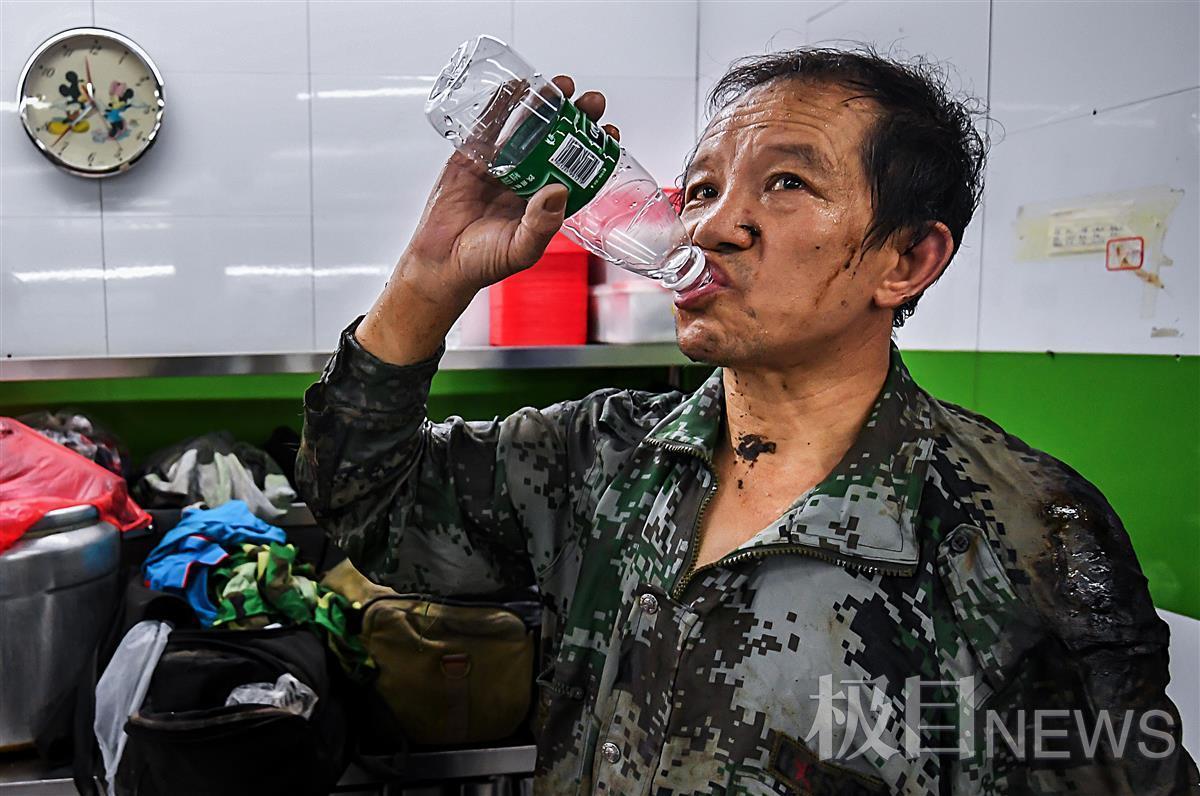 在油烟管道内连续工作两个小时后,肖绍芳感觉体力透支,出来休息一会,一瓶水一口就干了。