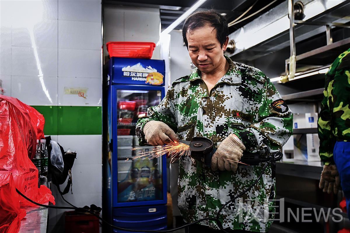 此刻,两位师傅正用打磨机细磨铲刀,“磨刀不误砍柴工。磨得锋利,才能有效对付深厚油泥和顽固污渍。”肖绍芳平静地说。