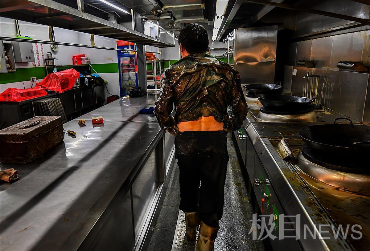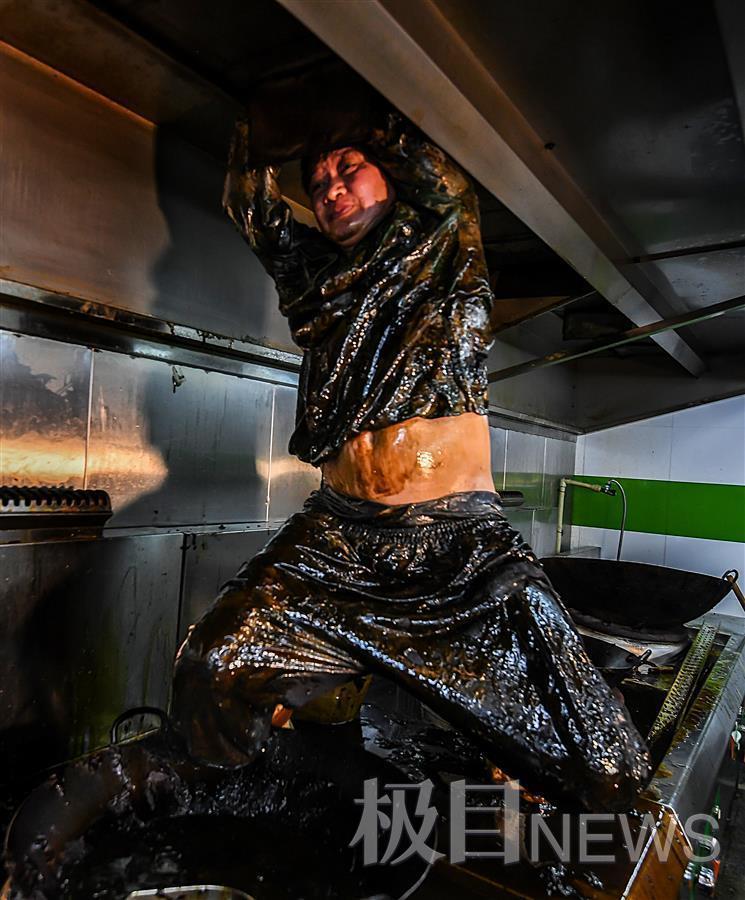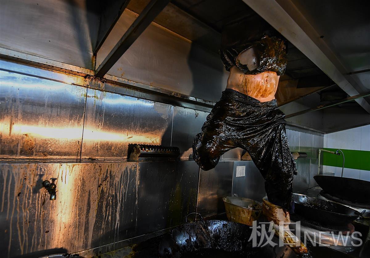 连续工作4个多小时,铲完油烟管道内的油污油渍,油污与汗水浸透了全身。