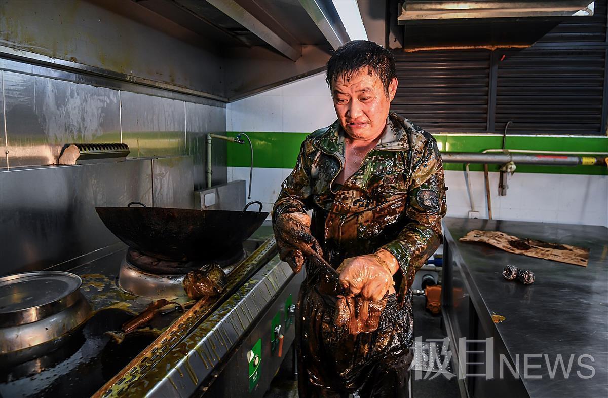 汗水模糊视线,烟熏眼泪流,也没法用沾满油污的手去擦拭,肖绍芳师傅只能摇摇头、用力眨眨眼,汗水泪水这才滴落下来,和着铲除的油污一同流走……