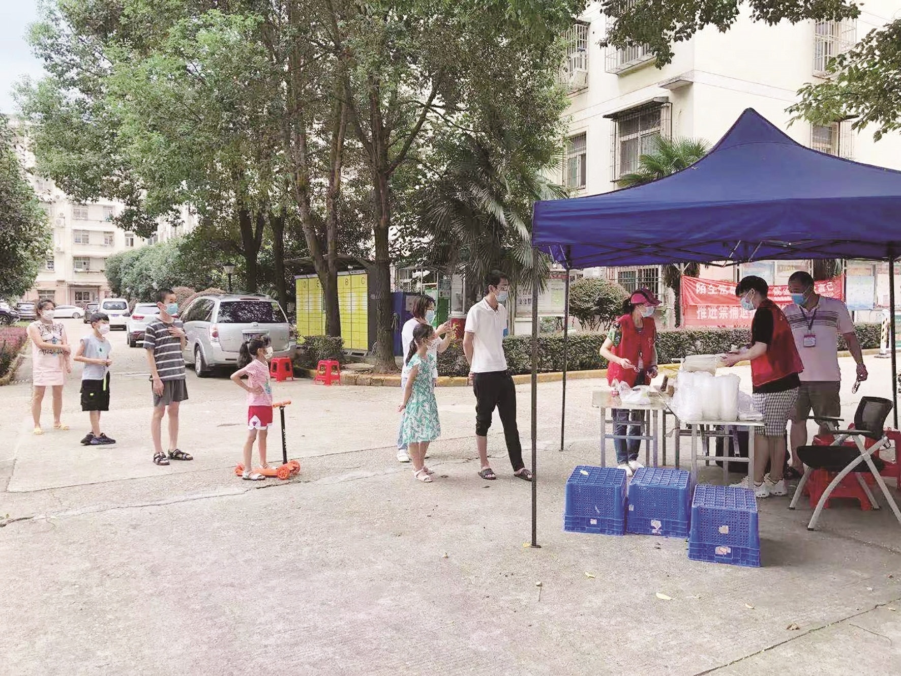 8月23日中午12时许,上午的下沉工作结束后,他来不及吃午饭就在小区广场上支起桌子,摆放好冰粉及山楂碎、葡萄干、花生碎等辅料,然后在居民群发布免费赠送冰粉的消息,不一会,小区广场上就按照防疫距离排起了长队,两名下沉干部受他感染,主动过来协助分发冰粉和维持领取秩序。