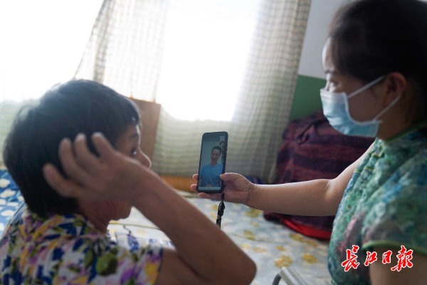 2021年9月3日上午,郑铭去看望小伟的妈妈,用手机让小伟和妈妈视频。记者彭年 摄