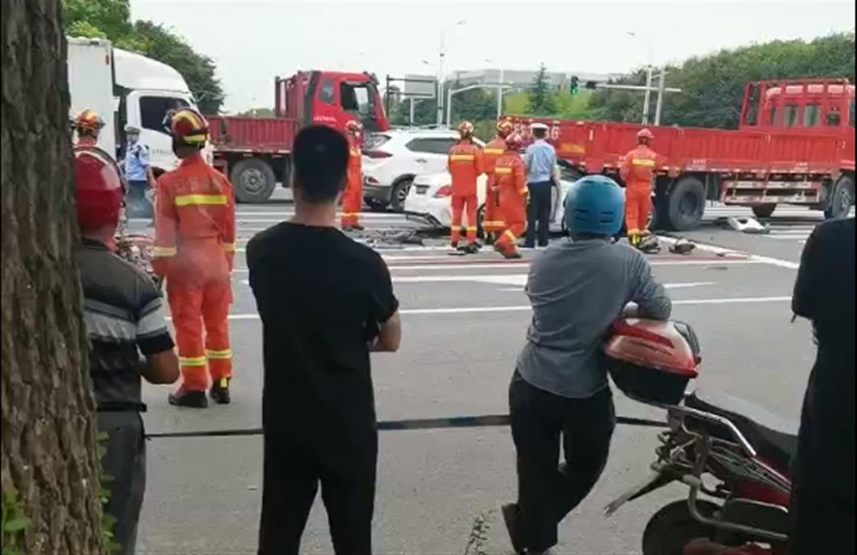 事发现场视频显示,在一十字路口,一辆白色奔驰轿车冲进一红色货车底部,轿车车头全部损毁,车后坐躺着一名男子,一动不动。周边车辆残骸较多,还有消防人员在现场处理。小轿车和货车均为上海牌照。