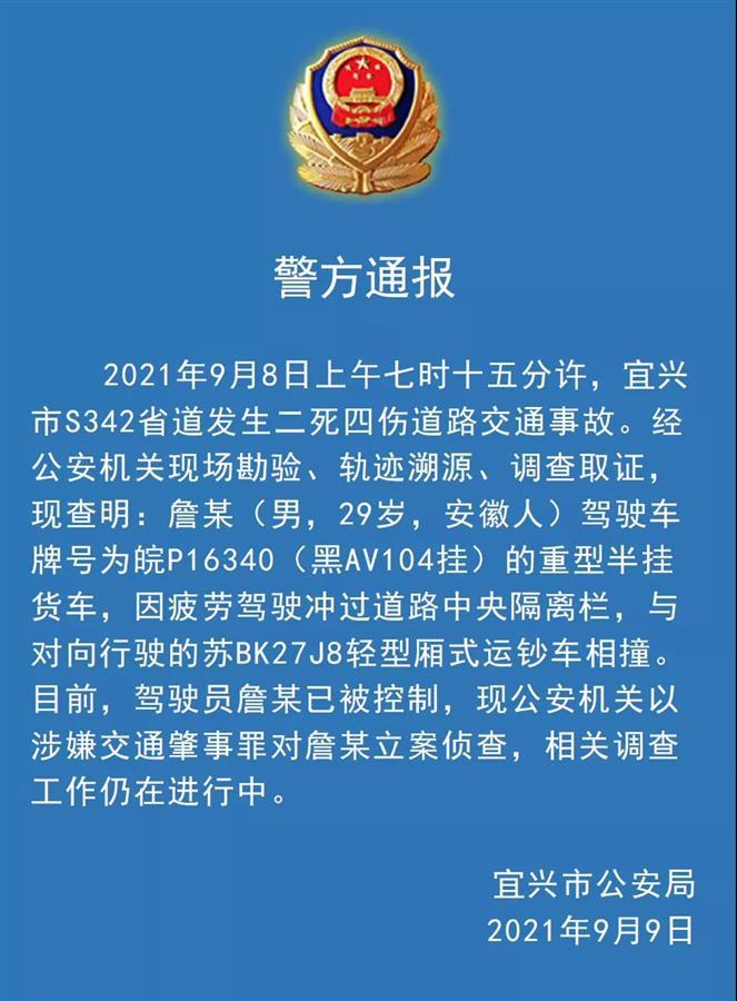 宜兴市公安局发布的通报显示,9月8日上午7时15分许,宜兴市S342省道发生2死4伤道路交通事故。经公安机关现场勘验、轨迹溯源、调查取证,现查明:詹某(男,29岁,安徽人)驾驶车牌号为皖P16340(黑AV104挂)的重型半挂货车,因疲劳驾驶冲过道路中央隔离栏,与对向行驶的苏BK27J8轻型厢式运钞车相撞。