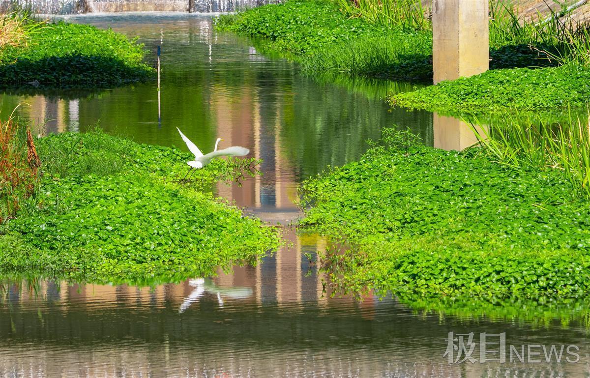 9月9日,极目新闻记者的镜头下,在武汉市江岸区,一条10米宽、1.5公里长的明渠如碧绿色的绸带,连接着塔子湖与黄孝河,清澈的水面泛着微波,两岸郁郁葱葱,红、紫色的水培鸢尾在生态浮岛上争奇斗艳,数只白鹭在此嬉戏。