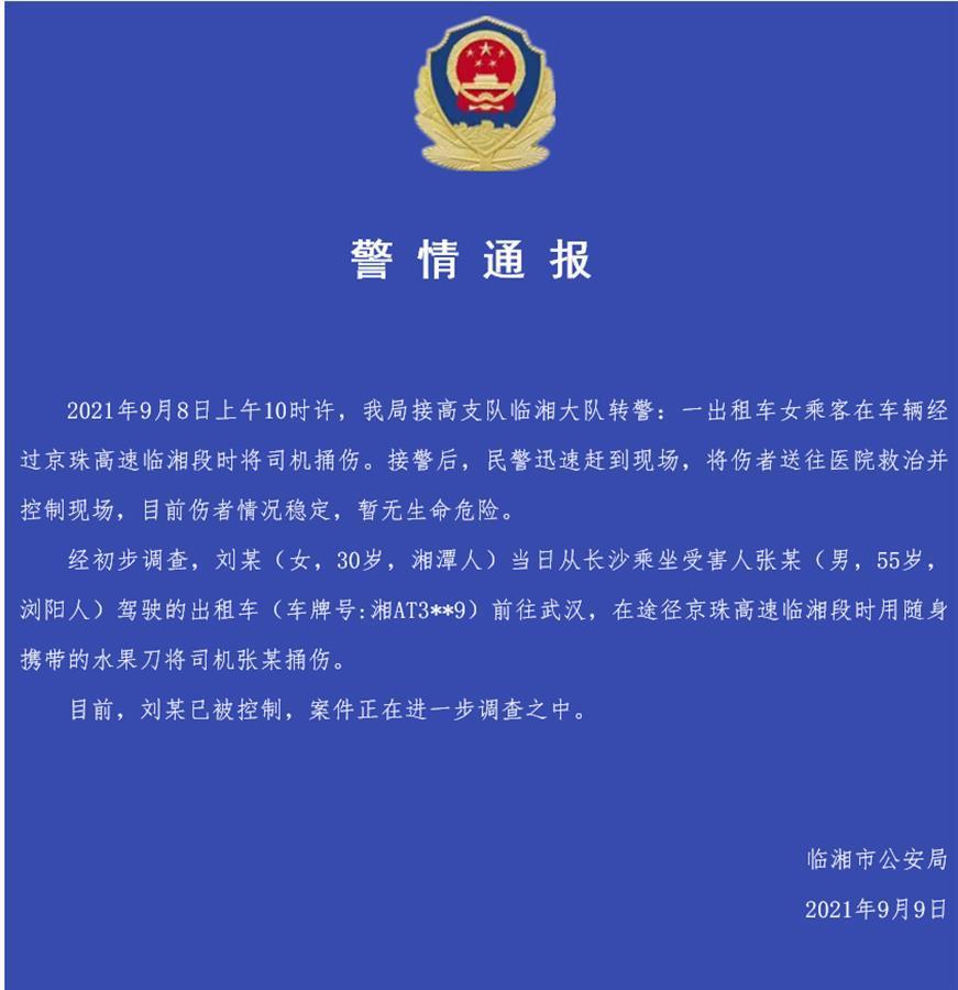 9日下午,临湘市公安局发布通报称,经初步调查,9月8日上午,刘某(女,30岁,湘潭人)从长沙乘坐受害人张某(男,55岁,浏阳人)驾驶的出租车前往武汉,在途经京珠高速临湘段时,用随身携带的水果刀将张某捅伤。目前,刘某已被控制。