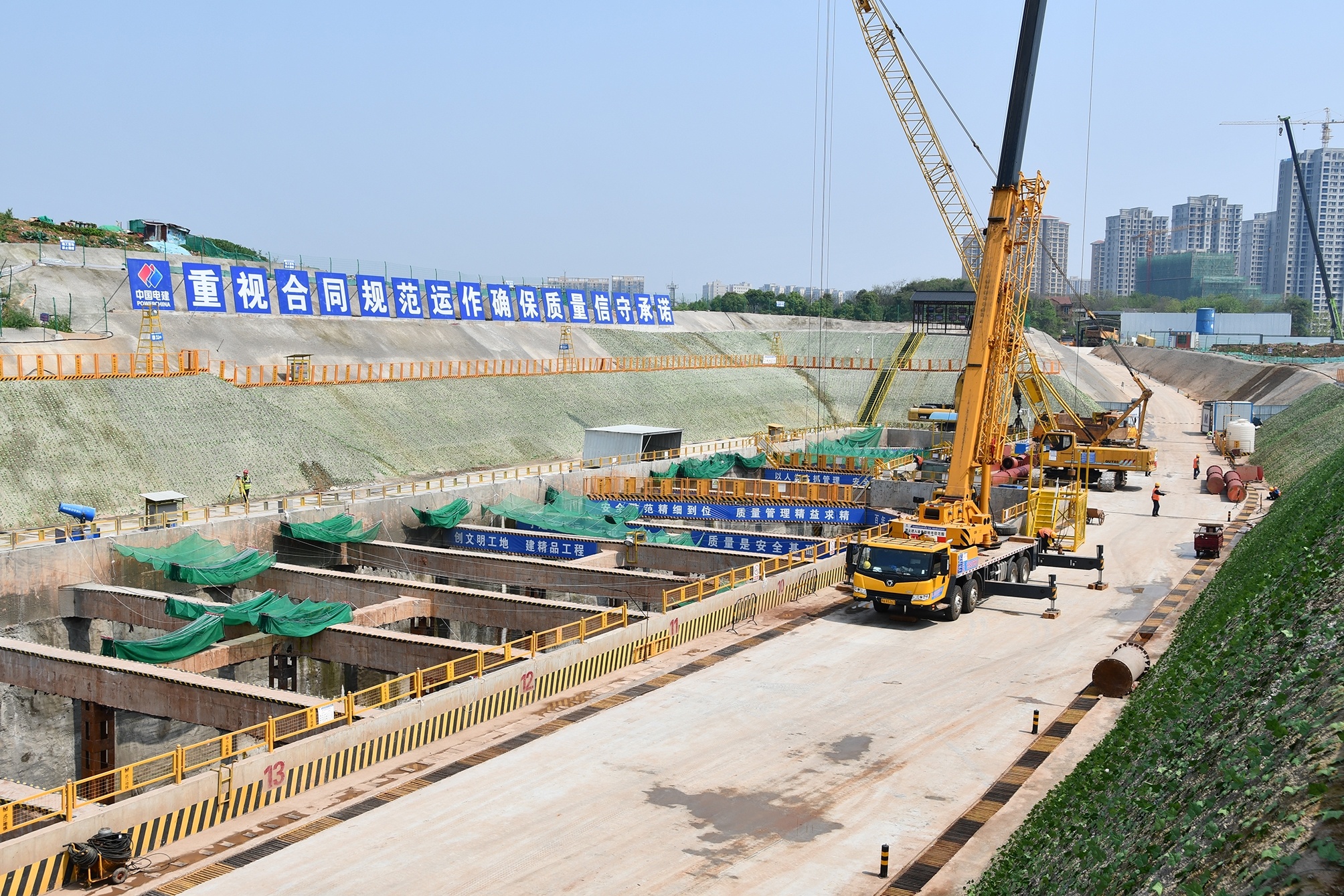 施工区实行全封闭式管理,由内向外形成闭合的环保回路,场内办公区与施工区进行了明显划分,并种植花草树木进行环境美化;项目外围统一设置3米高的镀锌钢围挡并布置喷淋系统,佐以雾炮、洒水车,在PM2.5、PM10指数较高时进行降尘;同时,现场配置20人的文明施工保洁班组,坚持每天打扫和随时清理,坚持标准化作业,做到文明施工常态化。