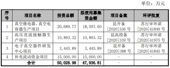 国力股份最终募集资金净额比原计划少2.43亿元。国力股份此前披露的招股说明书显示,公司拟募集资金4.79亿元,拟分别用于真空继电器、真空电容器生产项目、高压直流接触器生产项目、电子真空器件研发中心项目、补充流动资金项目。