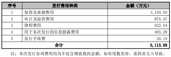 国力股份本次上市发行费用为5113.59万元,其中保荐机构招商证券获得保荐及承销费用3100万元。