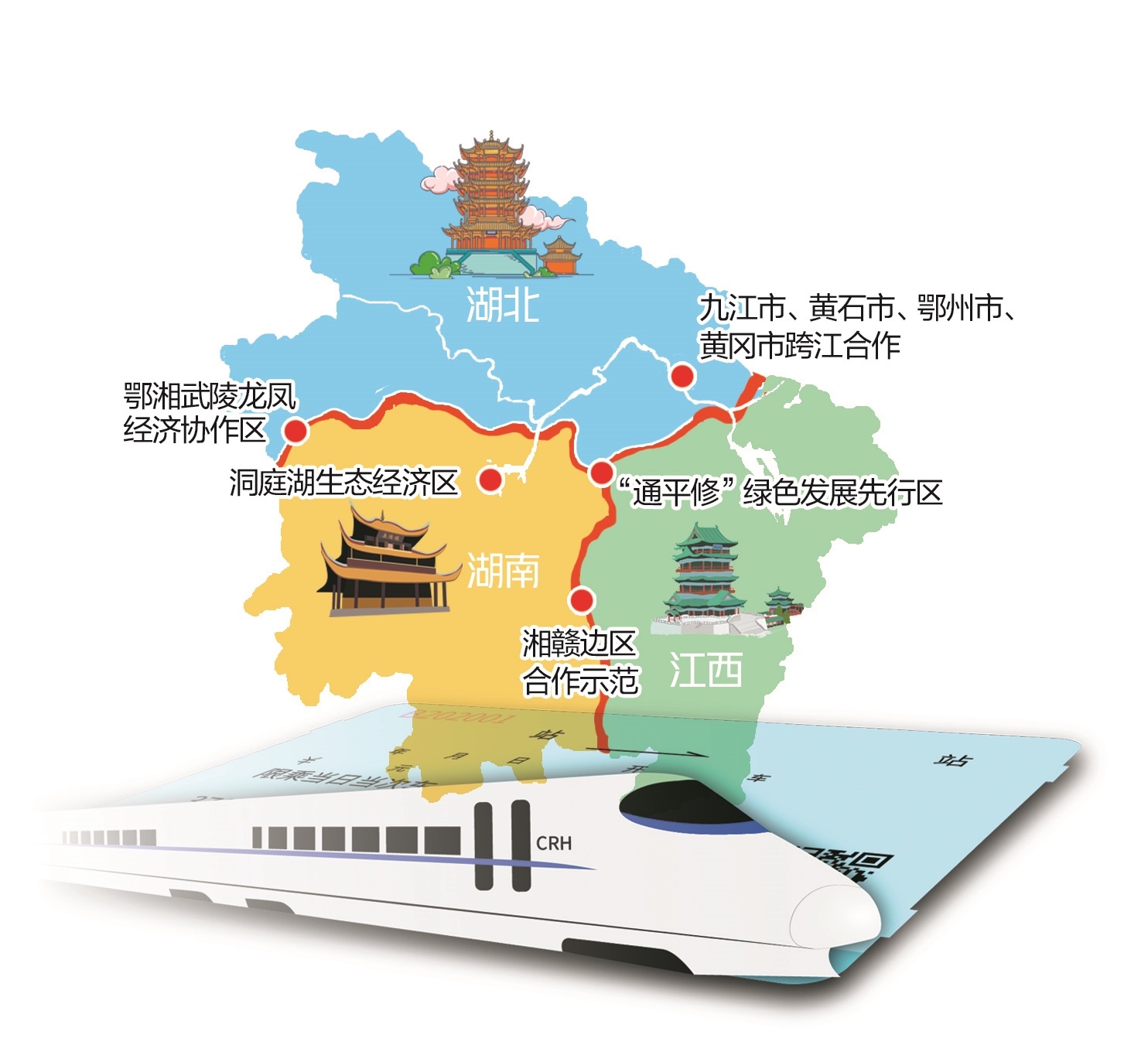 协议明确,三省将共建长江中游生态绿心,共建长江中游区域交通枢纽,共建长江中游文旅一体核心区,共建长江中游产业协同示范区,建湘鄂赣革命老区振兴发展示范区,重点实施生态环保、基础设施、产业发展、城乡协调、公共服务五个一体化工程。