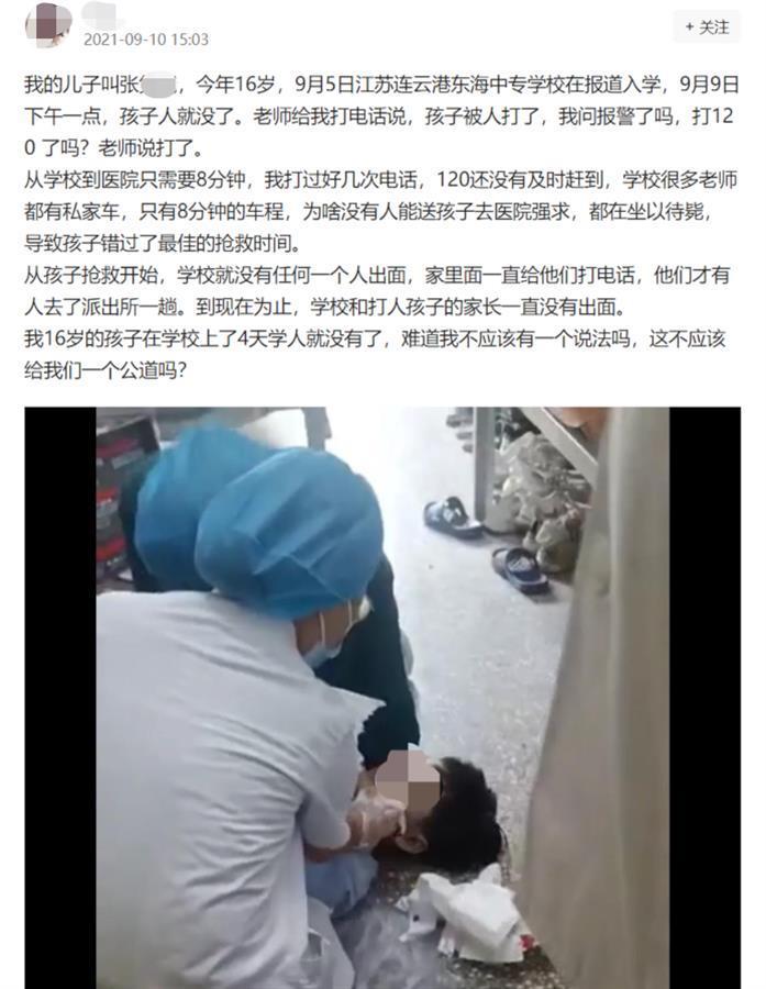 9月10日下午,网传江苏连云港东海中专学校一学生在校被同学殴打致死。孩子母亲在网络上发文称,儿子张某9月5日报到入学,仅四天后,孩子就在校被同学殴打致死。
