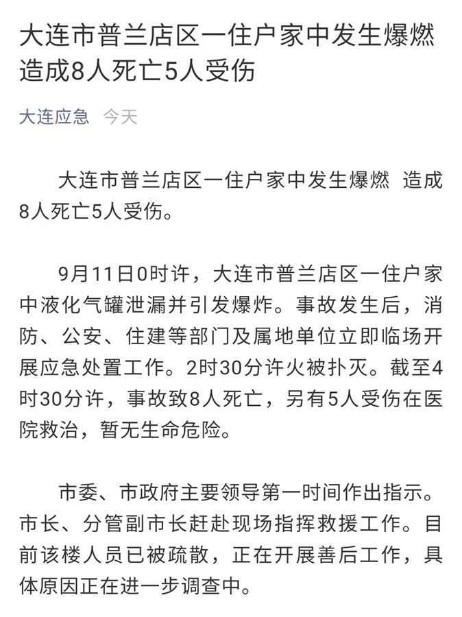 9月11日0时许,大连市普兰店区一住户家中液化气罐泄露并引发爆炸,截至4时30分许,事故致8人死亡,另有5人受伤在医院救治,暂无生命危险(极目新闻此前报道)。9月11日上午,起火楼栋一家底商工作人员陈女士(化姓)告诉极目新闻记者,自家店面也在大火中受到波及,目前起火楼栋被封锁,人员均已被疏散。