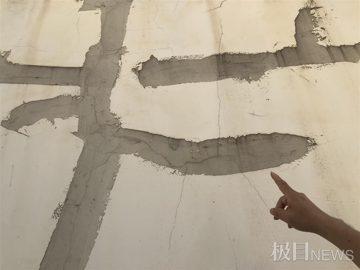 记者近距离观察发现,留在墙面的痕迹约有一手掌宽,按照墙体裂纹的走向不规则延伸分布。覃先生说,那些印记是施工人员使用防水涂料刷墙面裂缝留下的痕迹。