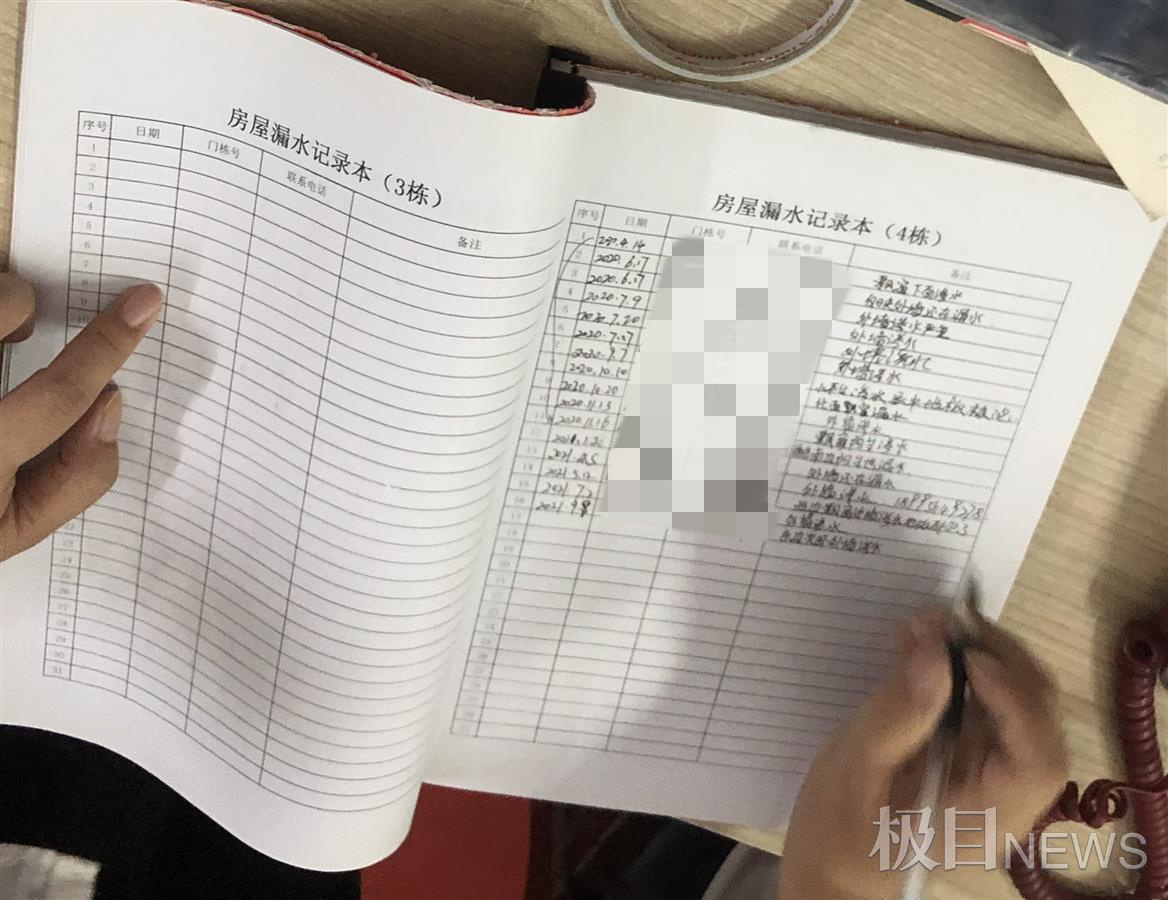 当覃先生向物业反映墙面渗水问题时,一名余姓工作人员拿出了一个登记簿,封面写着“房屋漏水记录本”。记者看到,该登记簿按照楼栋号进行归类,覃先生所在的4栋已经有16户居民进行了漏水登记。记者翻阅该登记簿发现,2栋居民楼登记漏水的较多,达到40多户。