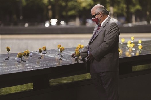 一名男子在“9·11”纪念广场缅怀逝者