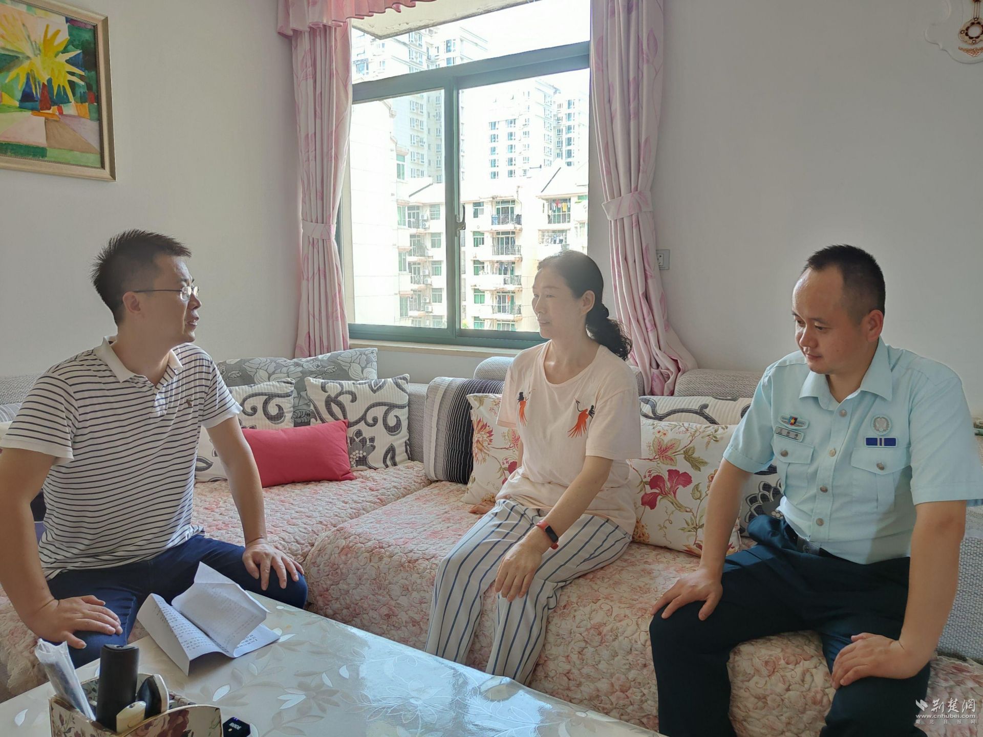 民兵连长董国庆1993年9月20日在塔尔头泵站抗洪抢险任务中壮烈牺牲。图为寻访专班倾听烈士遗孀王娥珥讲述英勇故事。程曦摄