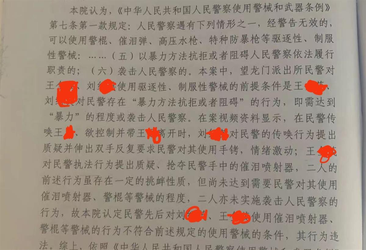 法院认为,本案中,望龙门派出所民警对王女士父母使用驱逐性、制服性警械的前提条件是两人对民警存在“暴力方法抗拒或者阻碍”的行为,即需达到“暴力”的程度或袭击人民警察。在案视频资料显示,在民警传唤王女士、欲控制并带王女士离开时,刘女士对民警的传唤行为提出质疑并伸出双手反复要求民警对其使用手铐,情绪激动;王先生对民警执法行为提出质疑、抢夺民警手中的催泪喷射器,二人的前述行为虽存在一定的挑衅性质,但尚未达到需要民警对其使用催泪喷射器、警棍等警械的程度,二人亦未实施袭击人民警察的行为,故该院认定民警先后对两人使用催泪喷射器、警棍等警械的行为不符合前述规定的使用警械的条件,其行为违法。