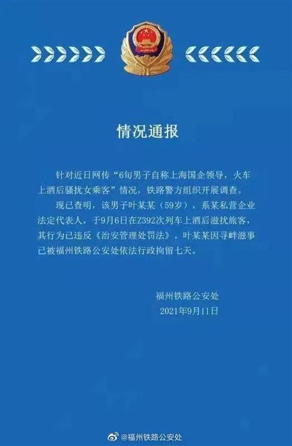 9月11日,福州铁路公安发布警情通报称,针对近日网传“6旬男子自称上海国企领导,火车上酒后骚扰女乘客”情况,铁路警方组织开展调查。现已查明,该男子叶某某(59岁),系某私营企业法定代表人,于9月6日在Z392次列车上酒后滋扰旅客,其行为已违反《治安管理处罚法》。叶某某因寻衅滋事已被福州铁路公安处依法行政拘留七天。刘女士告诉极目新闻记者,她注意到了这段通报。她表示自己并不知道叶某某的身份,还是希望叶某某能够向自己道歉。“当然我觉得这不可能了,我都要下车了他还在说我。”在刘女士看来,她当天下午5时30分下车时,叶某某已经休息过一段时间,是比较清醒的。但他却依旧对刘女士指指点点,这让刘女士十分气愤。刘女士称,叶某某至今并没有向她道歉。