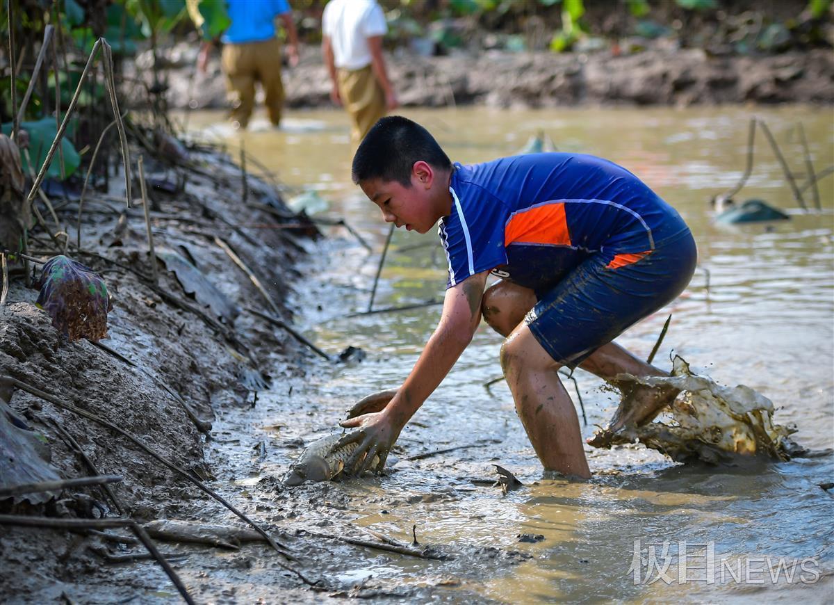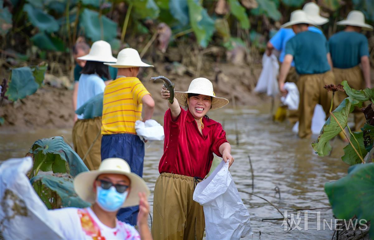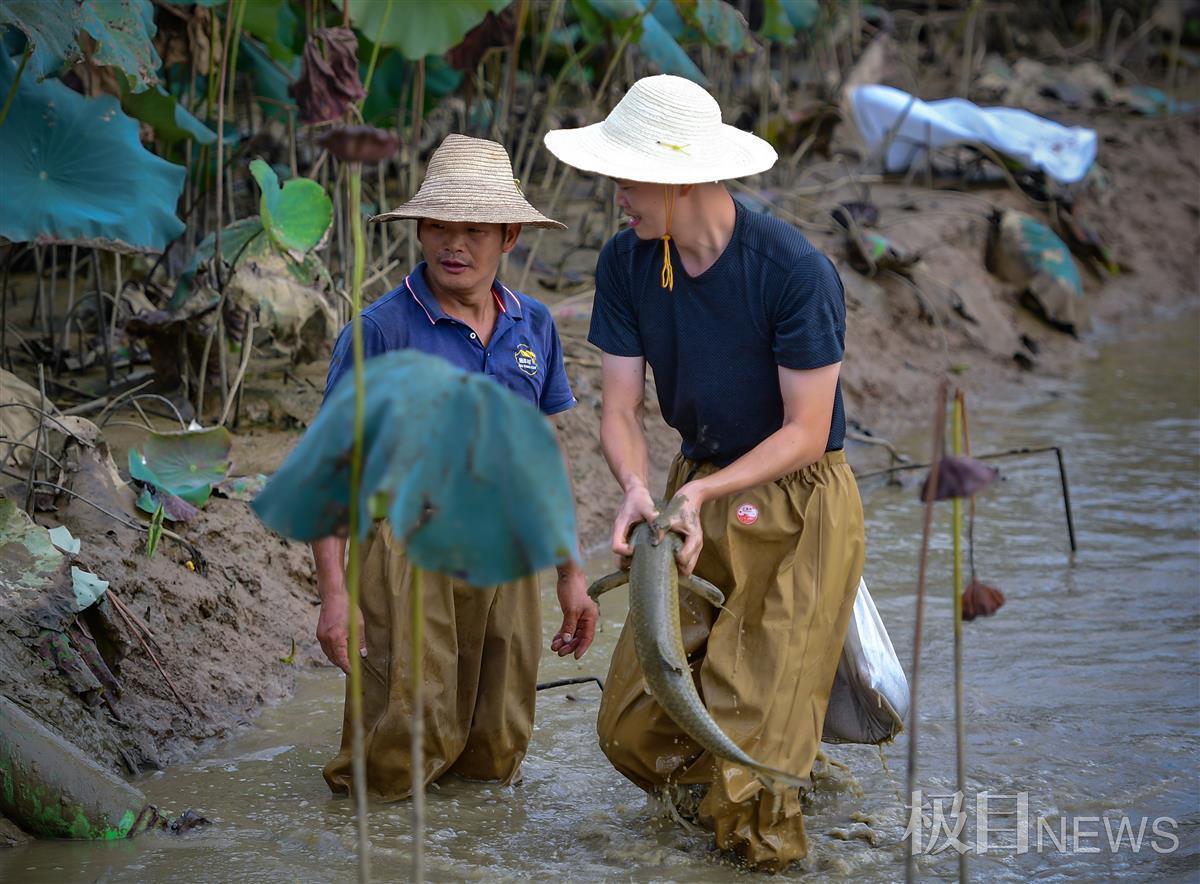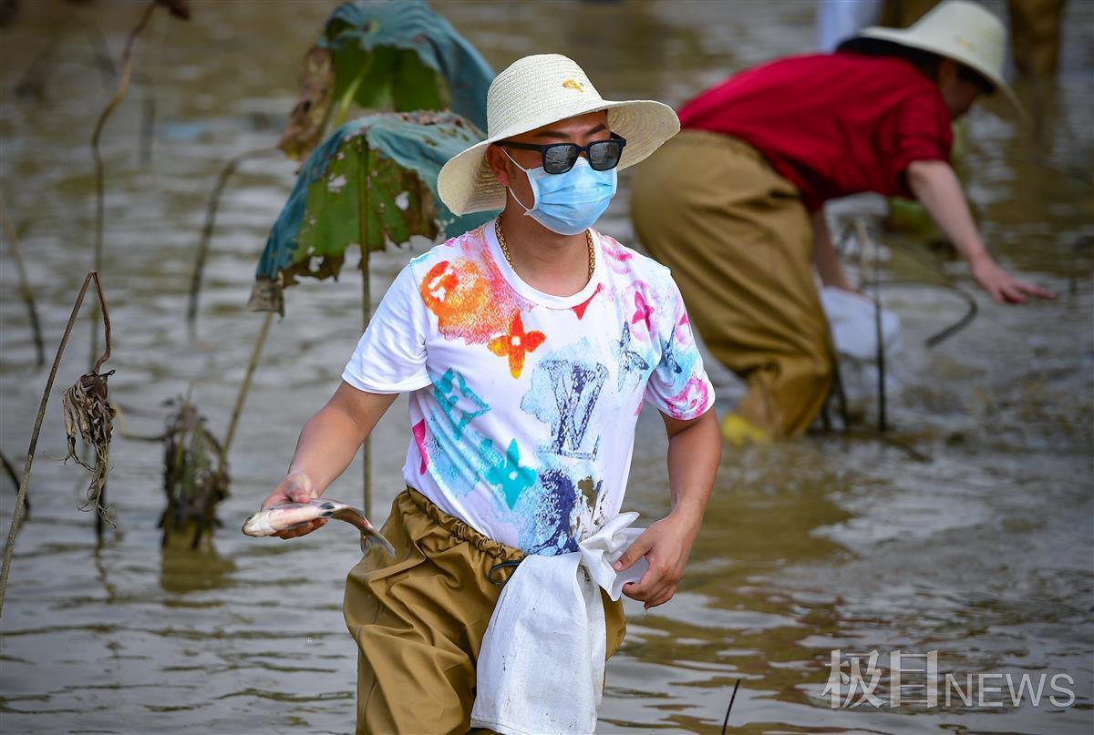 三年未干的一方藕塘里,村民们早早地抽浅了塘水,或是天热缺氧的原因,不时有鱼儿活碰乱跳地蹦出了水面,传递着丰收的喜悦。山村的活动也不缺仪式感,65岁的村民杨盛旺,身着古老的祭祀服装祈福,感谢上苍恩赐海洋村山青水秀、物产丰饶、村民安康!一声令下,热闹非凡的捕鱼活动便开始了。数十名游客和村民们,穿戴雨裤,头顶草帽,迫不及待里冲进鱼塘,一试身手,期望抢得头彩。水里的鱼儿,听到人声,开始加速四处逃窜。