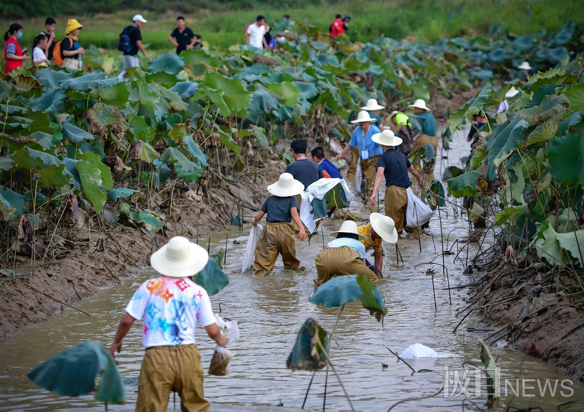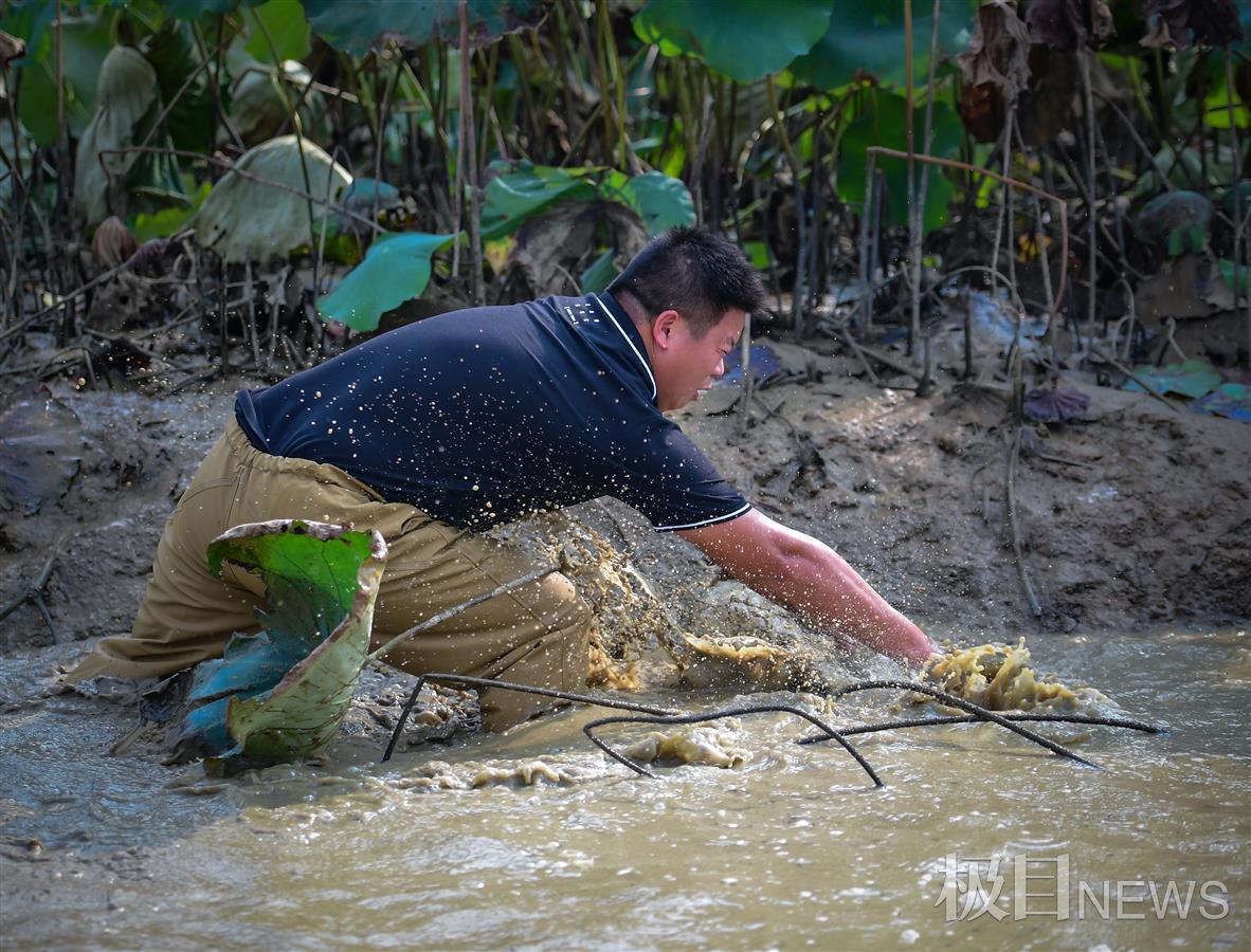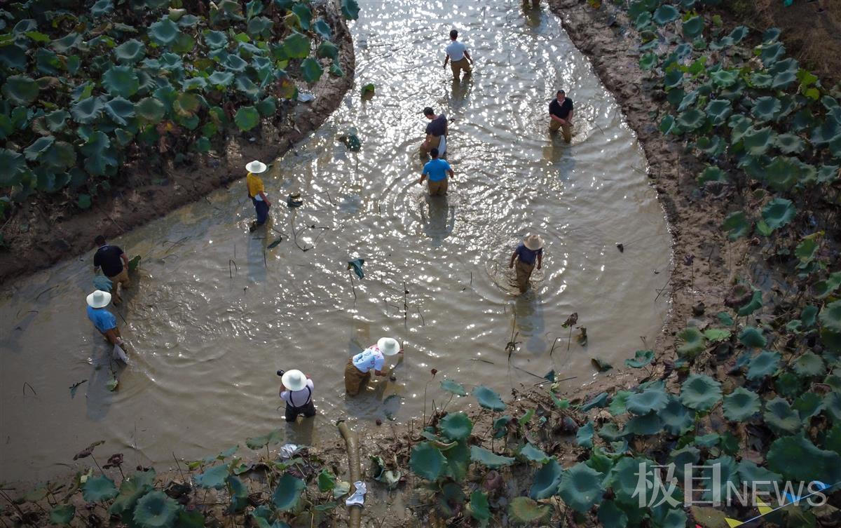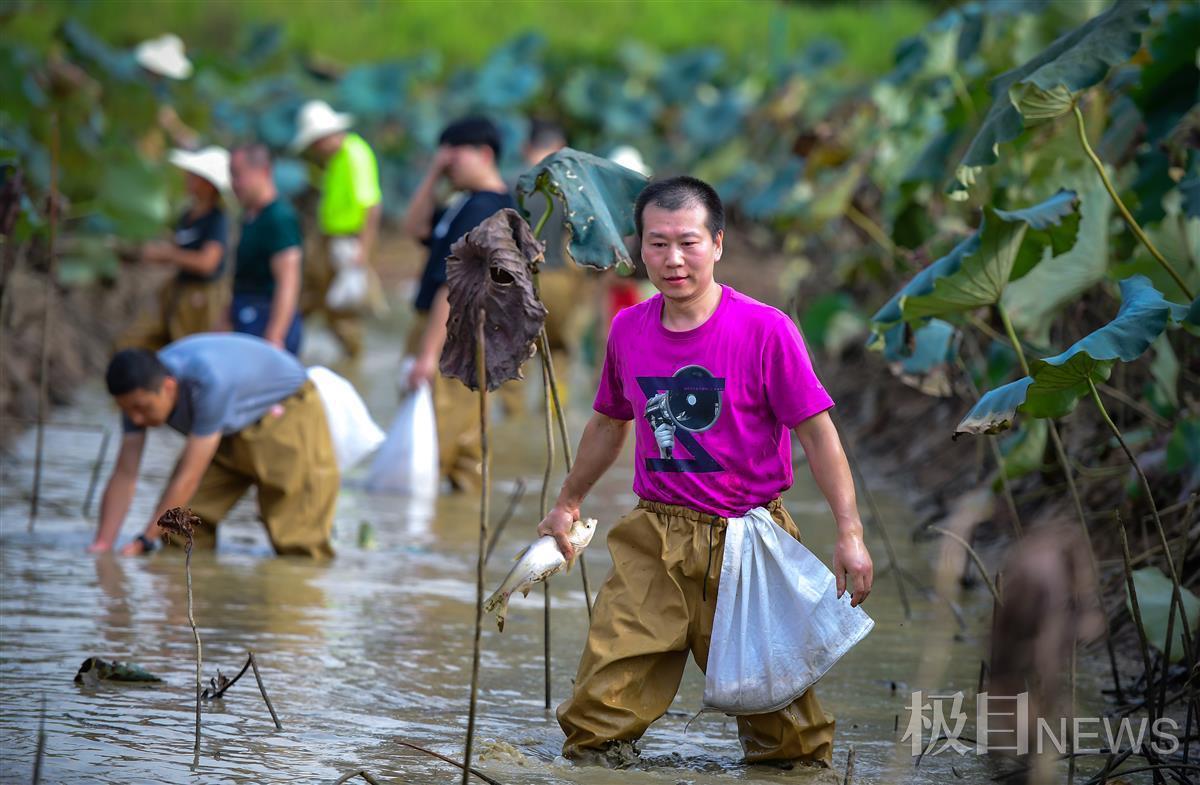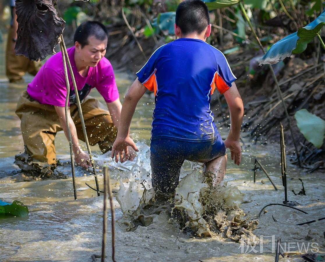 三年未干的一方藕塘里,村民们早早地抽浅了塘水,或是天热缺氧的原因,不时有鱼儿活碰乱跳地蹦出了水面,传递着丰收的喜悦。山村的活动也不缺仪式感,65岁的村民杨盛旺,身着古老的祭祀服装祈福,感谢上苍恩赐海洋村山青水秀、物产丰饶、村民安康!一声令下,热闹非凡的捕鱼活动便开始了。数十名游客和村民们,穿戴雨裤,头顶草帽,迫不及待里冲进鱼塘,一试身手,期望抢得头彩。水里的鱼儿,听到人声,开始加速四处逃窜。