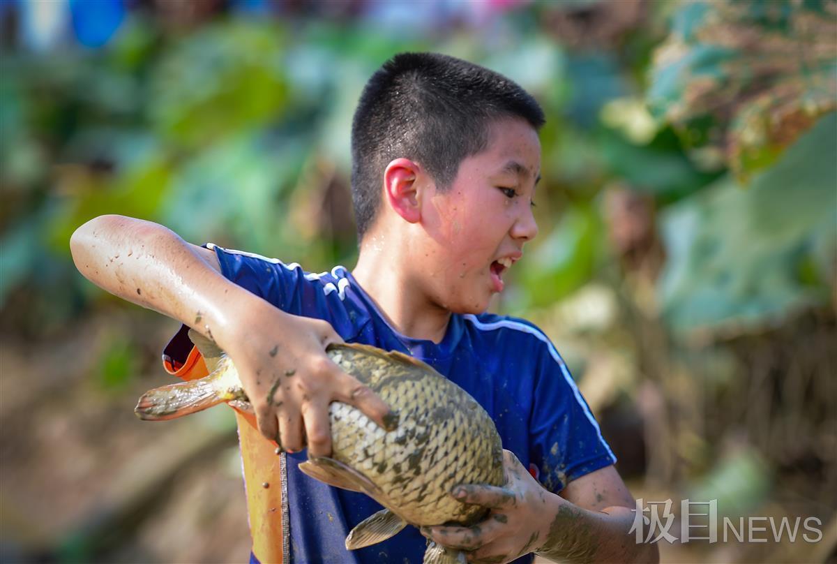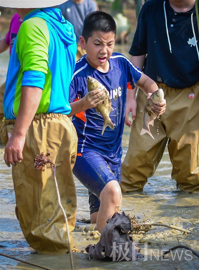 抓鱼也要斗智斗勇。看准大鱼,缓身靠近,一把按住,再慢慢捧出水面,哪知鱼儿调皮地一摆尾,泥点溅了一身,抓鱼游客和村民的脸上也笑成了花。抓鱼现场,欢笑声一片。有人为到手的鱼儿溜走遗憾,有人为陷入淤泥而苦笑,更多的是抓到鱼后的兴奋和快乐。有小朋友专程从武昌赶来抓鱼,穿着泳衣就下了塘,虽是第一次,但学着村民的架势,左摸摸,右摸摸,还真发现一条大草鱼,瞅准时机,一个箭步猛扑上去,双手用力下按,终于逮住了那条肥美的草鱼,随后,全场都能听到向岸上父母报喜的声音:“爸爸你看,妈妈你看,我抓了一条大鱼。”