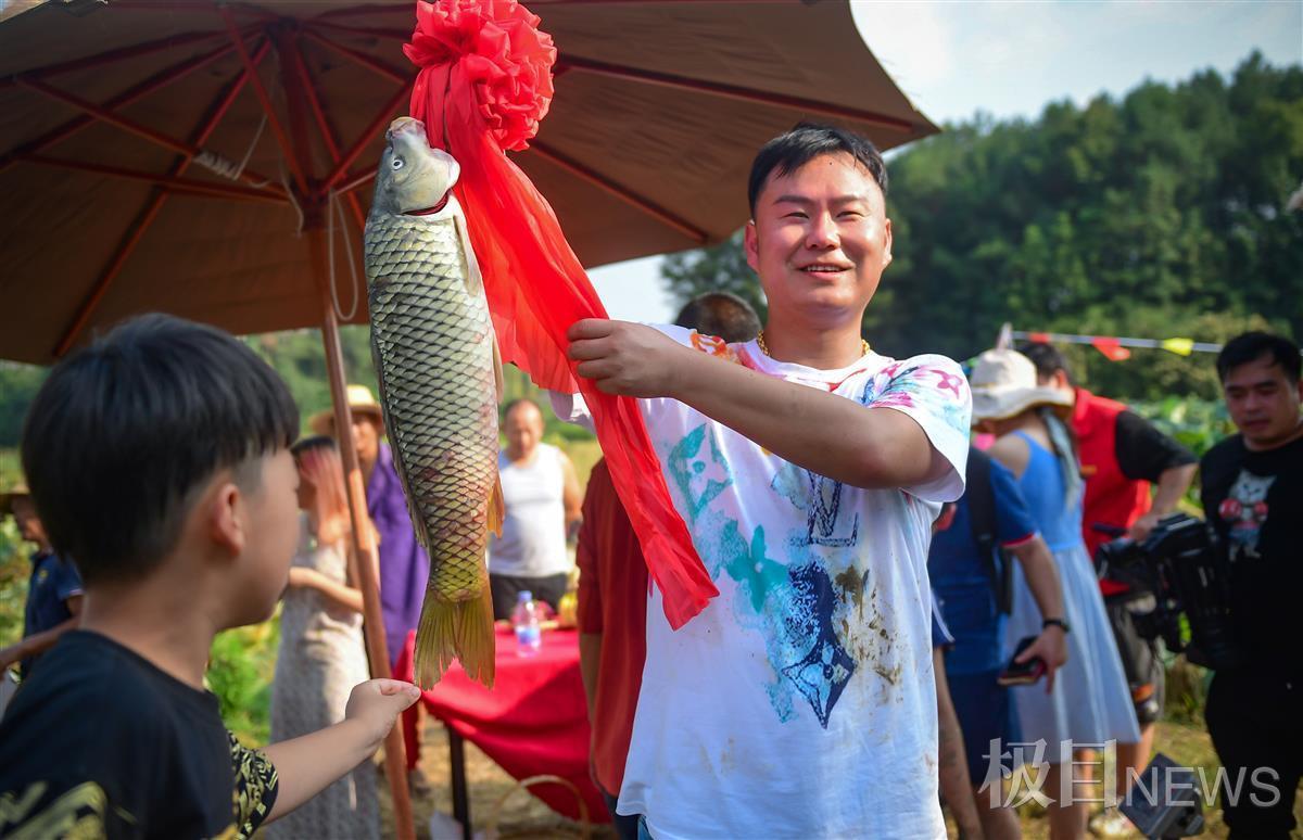 来自武汉的毛先生则十分幸运,在城市长大的他,第一次下水抓鱼,就逮住了今年的鱼王——一条约8斤的鲤鱼,不仅可以免费带回家,还拿到了海洋村提供的1888元礼券。抱着扎有红绸的鱼王合影,毛先生难掩兴奋:“天气虽然热了点,但捉鱼还真是过瘾。加上今天中了头彩,体验感和收获感满满,真是没白来,明年我还要来!