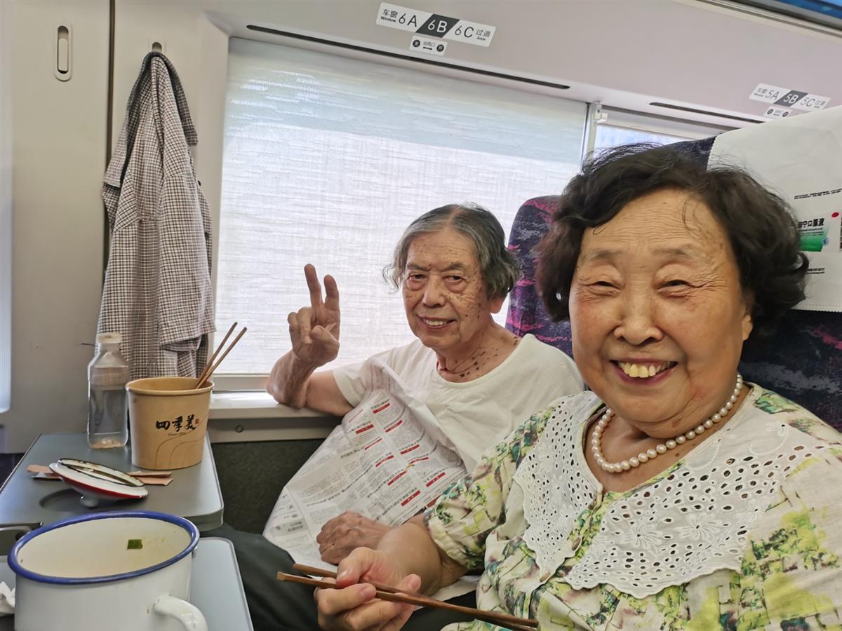 动车上冷气很足,正在睡觉的诸期觉得后颈有些凉意,龙志明让记者从行李箱中取出一件外套,给老伴披上。出发前,她发现上海未来几天可能有台风天气,她给自己和老伴都准备好了防风的衣服。