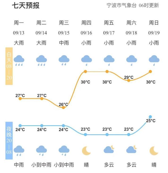 据市气象台预报,13日到14日有暴雨到大暴雨,局部特大暴雨,15日大雨部分暴雨。过程雨量200~350,个别600以上(四明山区域)。台风“列车效应”可导致单点强降水,最大小时雨强可达80~120 毫米。13日到14日沿海海面和杭州湾可达13~15级、沿海地区12~14级、内陆10~12级。15到16日沿海海面仍有10~12级大风。