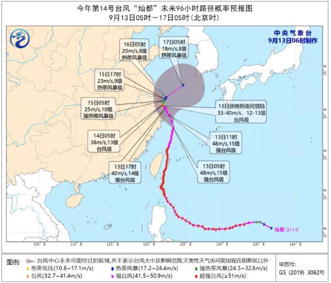 央视网消息:今年第14号台风“灿都”(强台风级)13日07时中心距离我市象山县东偏南方向约165公里,28.7°N,123.4°E,15级(48米/秒),945百帕。预计,其将以每小时25公里左右的速度向北偏西方向移动,强度缓慢减弱,今天下午穿过舟山群岛,有可能于今天傍晚至夜间在上海浦东到江苏启东一带沿海登陆,也可能在杭州湾到长江口一带回旋,16日开始转向东北方向移动。