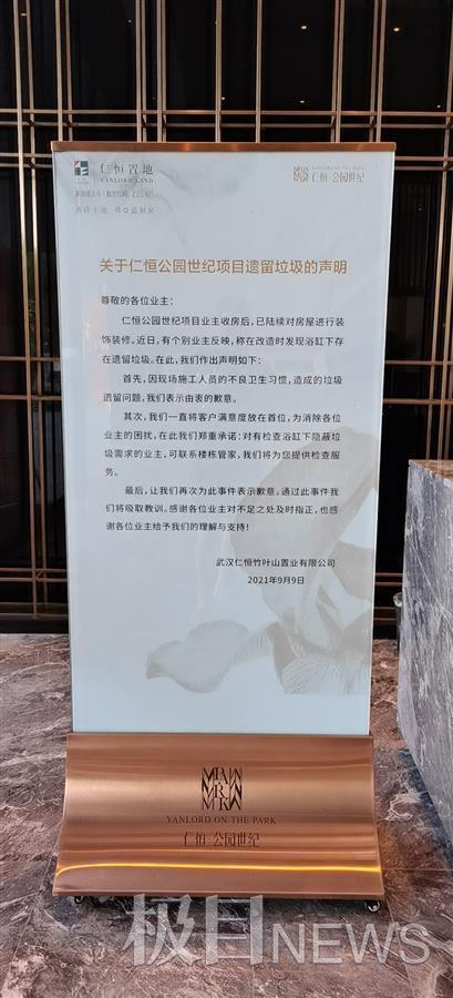 针对这种情况,极目新闻记者注意到,9月9日,仁恒公园世纪项目开发商武汉仁恒竹叶山置业有限公司已发出声明。声明中写道:“首先,因现场施工人员的不良卫生习惯,造成的垃圾遗留问题,表示由衷的歉意。其次,我们一直将客户满意度放在首位,为消除各位业主的困扰,在此我们郑重承诺:对有检查浴缸下隐蔽垃圾需求的业主,可联系楼栋管家,我们将为您提供检查服务。最后,让我们再次为此事件表示歉意。通过此事件我们将吸取教训。感谢各位业主对不足之处及时指正,也感谢各位业主给予我们的理解与支持!”