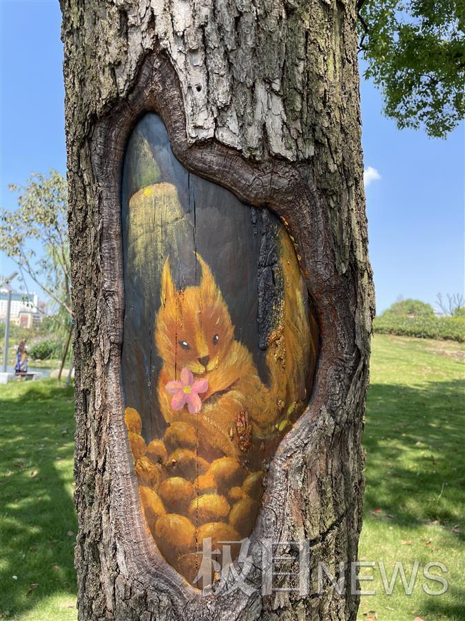 据悉,紫阳公园对树干空洞进行修补时,为美化的效果,特意请来艺术院校毕业的志愿者使用丙烯颜料,在修补后的树洞处作画,主题为“呆萌小动物”。