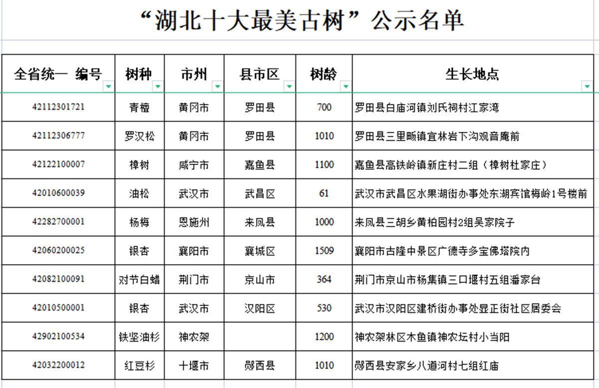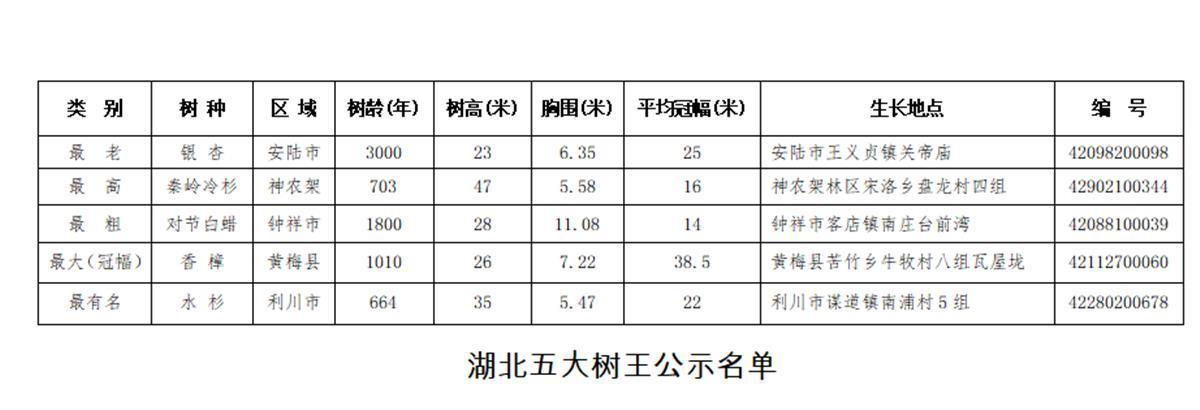 今日,湖北省林业局正式对外发布首次评选的“湖北五大树王”和“十大最美古树”名单(详见表格),意在加大重视爱树护树,展现古树风采,传承历史文化。