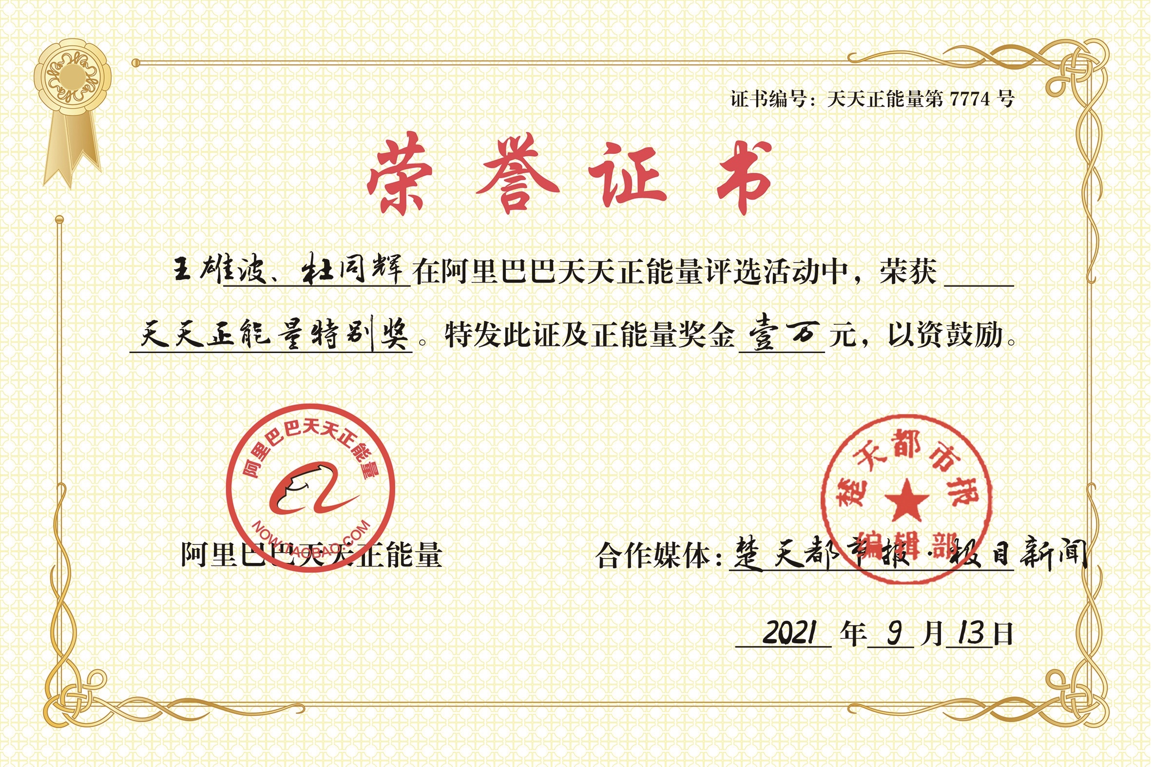 9月13日,阿里巴巴天天正能量联合楚天都市报·极目新闻,为9·12长江连环救人者王雄波和杜同辉颁发天天正能量特别奖,并奖励两位见义勇为者1万元奖金。