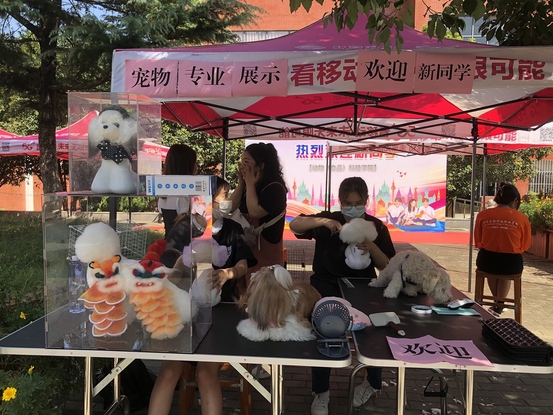 极目新闻记者在现场看到,在该校操场和路边的空地处,有摄影社团、心理沙盘等各类社团的摊位。在该校许多学院门口,也在“摆摊”展示含有学院特色专业的社团。在该校动科学院的展台上,两只可爱的小宠物狗被做出各类造型,展台后的学生也拿着联系用的毛绒宠物狗,正在剪毛;在水产养殖专业的展台上,“淡水鲨”“兰寿”“罗汉”“潜水艇”等各式各样的观赏鱼被展示,一旁的师生也在给路人介绍各类鱼的生活习性和养殖方法;在食品专业的展台上,摆放着各式各样的西点蛋糕和自制饮品,招呼路人前来品尝。