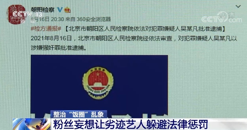 不久前,北京市朝阳警方发布通告,宣布曾经是一线流量明星的吴某凡因涉嫌强奸罪被依法刑事拘留。在这个劣迹艺人的背后还有个疯狂的“饭圈”。一些狂热粉丝甚至发表“出格”言论,妄想让自己的偶像躲避法律处置,已经走到了违法犯罪的边缘。