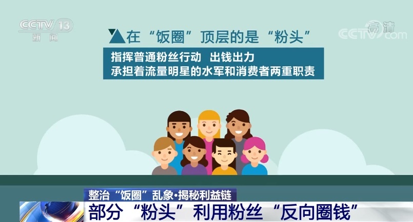 在“饭圈”内部,群体有着不同的分工。一部分狂热的、处在顶层的粉丝叫作“粉头”,号召普通粉丝完成各种“任务”来支持流量明星获利、增加偶像曝光率。其中有的“粉头”就诱导粉丝集资、鼓动重复消费,利用粉丝对偶像的喜爱“反向圈钱”,在资本的推动下操纵底层粉丝扮演经纪公司的“免费水军”。