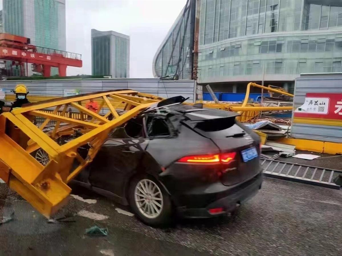监控视频显示,工地一高压旋喷桩突然倒下,砸中路过车辆,激起阵阵灰尘。另现场视频显示,一辆黑色汽车车头已经被砸损毁,现场有交警和急救人员处置。