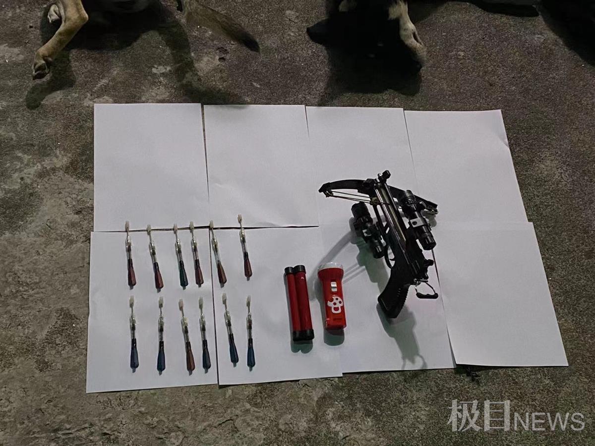 办案民警经过连续多日的追踪和摸排,最终于9月11日凌晨03:36分,在赤壁市官塘驿镇京珠高速泉口收费站,将2名犯罪嫌疑人人赃俱获,现场查获一辆无牌作案车辆,被盗土狗19只,作案弓弩一把,毒针若干。