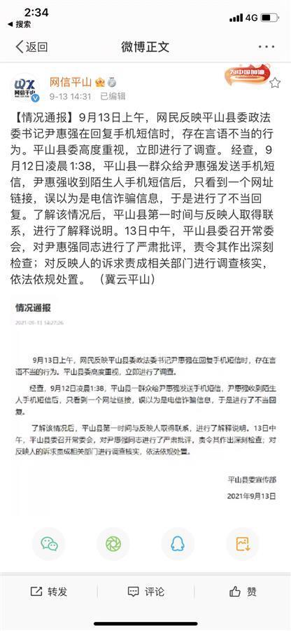 该图片曝光后引起极大关注。9月13日下午,平山县委宣传部回应称经调查,9月12日凌晨1:38,平山县一群众给尹惠强发送手机短信,尹惠强收到陌生人手机短信后,只看到一个网址链接,误以为是电信诈骗信息,于是进行了不当回复。了解该情况后,平山县第一时间与反映人取得联系,进行了解释说明。13日中午,平山县委召开常委会,对尹惠强同志进行了严肃批评,责令其作出深刻检查;对反映人的诉求责成相关部门进行调查核实,依法依规处置。