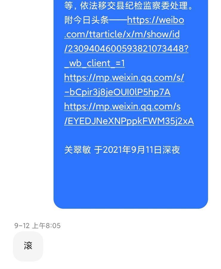 9月13日,一张网传截图显示,9月12日凌晨1时许,平山县一群众向县政法委书记尹惠强发送短信反映拆迁款补偿等问题,9月12日早8时许收到对方回复“滚”。
