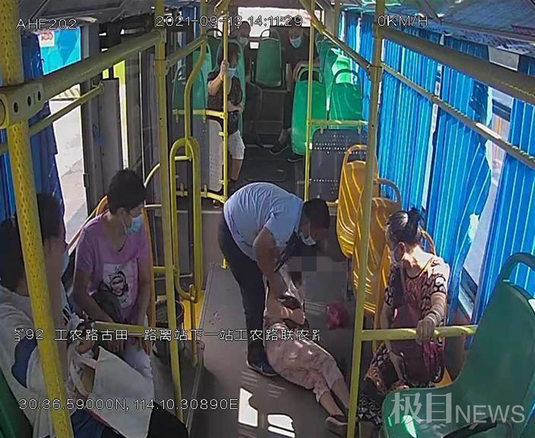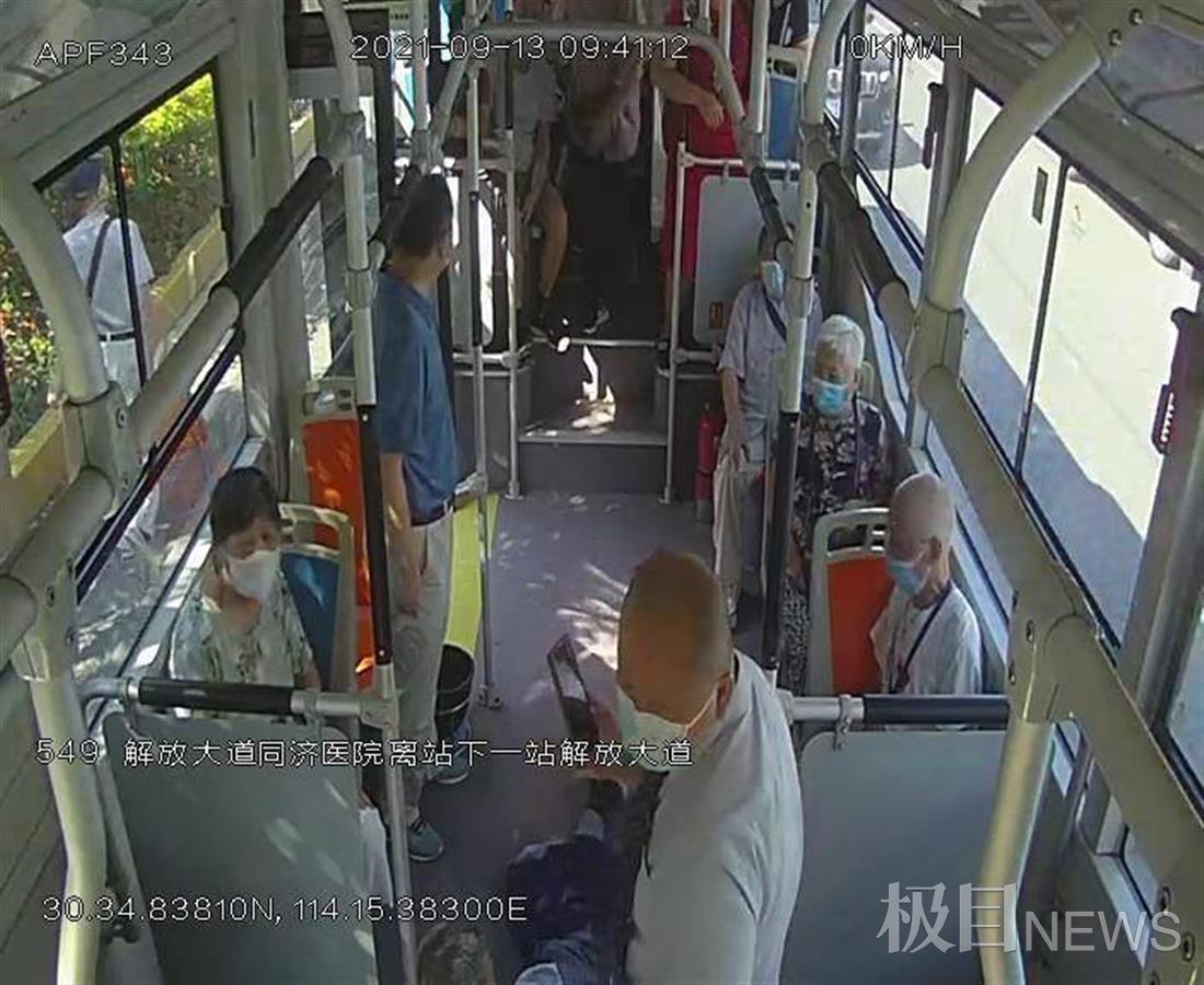 记者在车载视频中看到,9月13日上午,武汉549路自编号224号公交车开往青山方向。9:39,从解放大道同济医院站离站后,站在车厢中部的爹爹突然昏迷,倒在了地上。车上乘客一阵惊呼,说有人晕倒了,当班司机杨猛赶紧靠边停车,拉好手刹跑过去,查看老人情况。发现老人脸色蜡黄,口吐白沫一样的类似呕吐物,当时已经昏厥了。