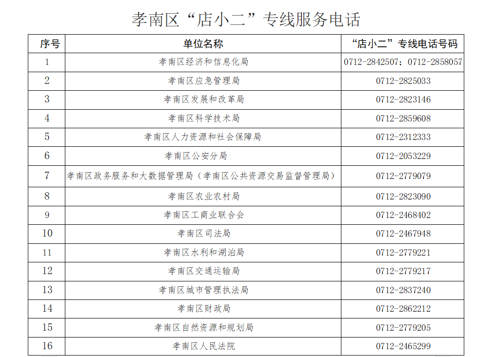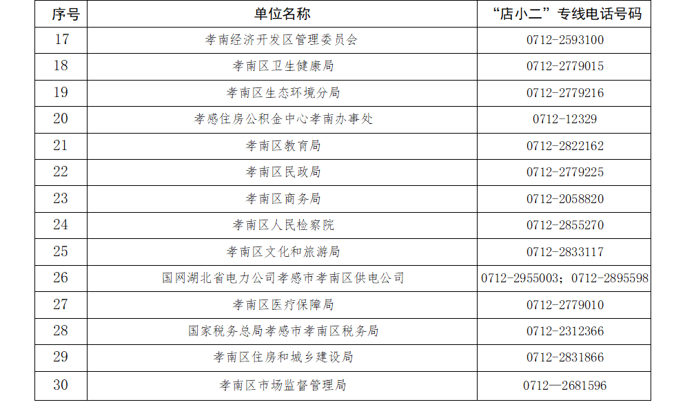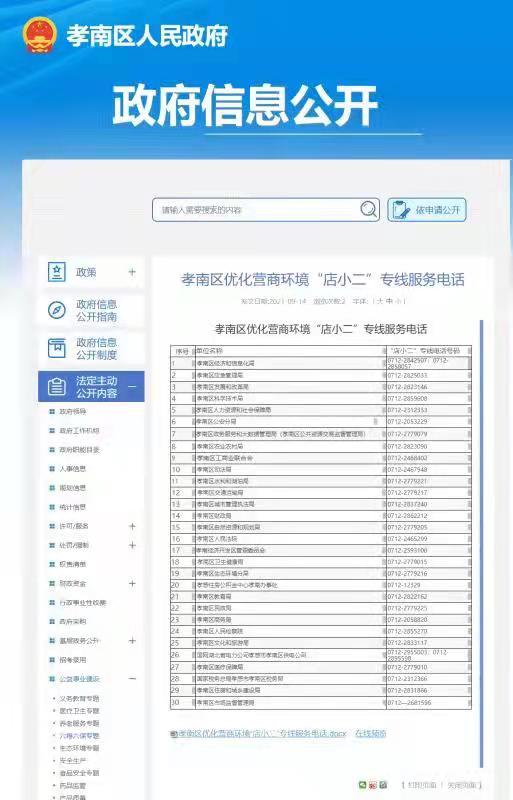 孝南区政府门户网站中公示优化营商环境“店小二”专线服务电话
