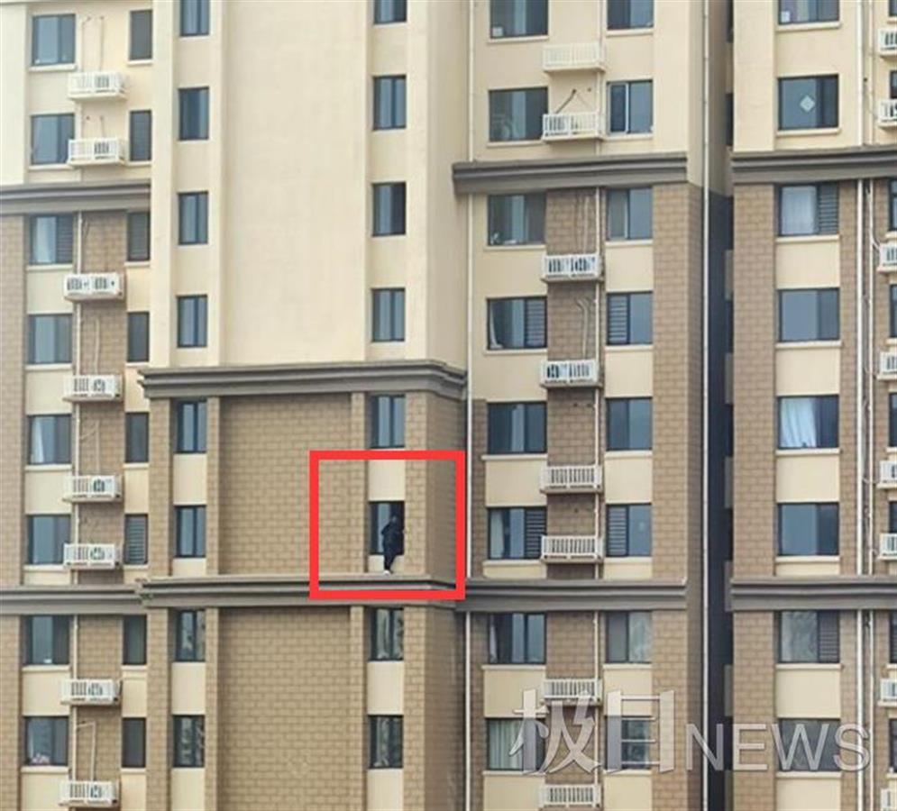 男子仍扒在小区居民楼高层的外沿处与警方对峙(视频截图)