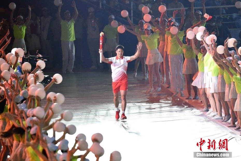 苏炳添担任第一棒火炬手入场。中新社记者 侯宇 摄