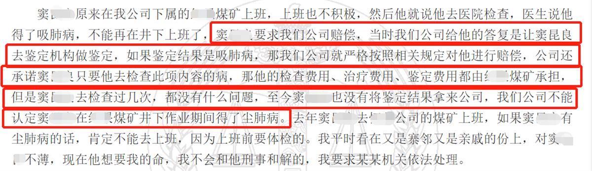 被害人余某表示,窦某曾在自己的煤矿上班,后来怀疑自己得了尘肺病,要求赔偿。“当时公司的答复是让他去做鉴定,如果鉴定结果是尘肺病,公司就按照相关规定进行赔偿,公司还承诺检查费用都由公司承担。但是他去检查过几次,都没有什么问题,至今也没有将鉴定结果拿来公司,所以公司不能认定他在煤矿井下作业期间得了尘肺病。并且,去年窦某在另一公司的煤矿上班,如果他有尘肺病的话,肯定不能去上班,因为上班前要体检的。”余某还提到,因为考虑和窦某是亲表兄弟关系,三次共计给了窦某8万元。