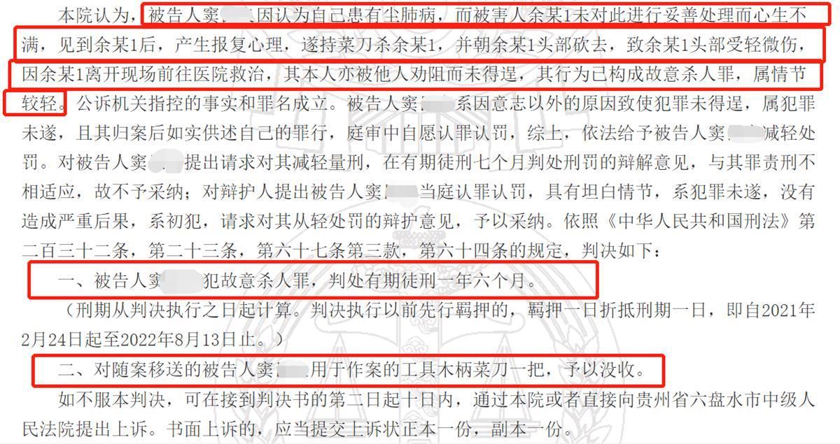 贵州男子窦某曾在表兄弟余某的煤矿上班,他自认为在煤矿工作导致尘肺病,而余某对此未妥善处理,心生不满酒后用刀将余某砍伤。2021年8月12日,当地法院以故意杀人罪判处窦某有期徒刑一年六个月。