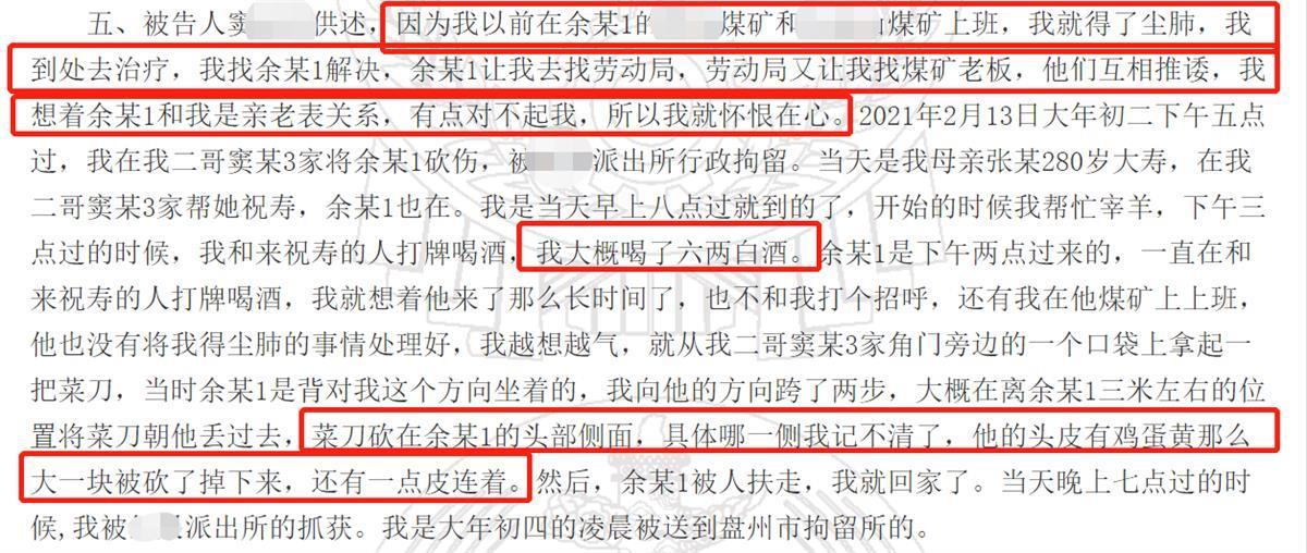 被告人窦某被抓后则供述,自己用刀砍余某主要是因为在煤矿上班得了尘肺病,丧失了劳动能力,而余某没有处理好,所以怀恨在心。窦某还称,自己伤人当天大概喝了六两白酒,现在知道自己的行为不对,愿意接受法律的制裁。