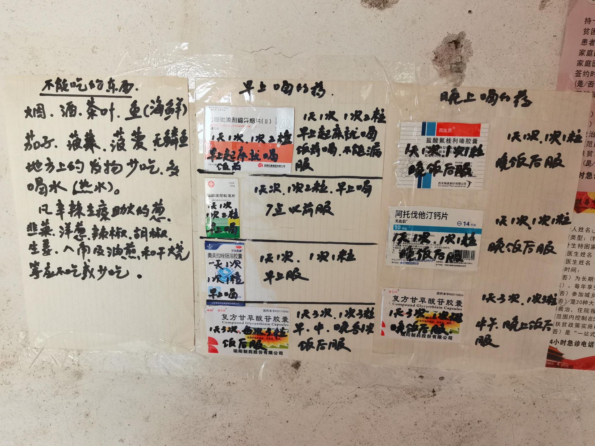 在老人家的墙上,记者看到王文艮给老人制作的“喝药提示”和“忌口提示”,哪种药一天吃几次,早上吃多少,中午、晚上吃多少,吃药期间哪些东西不能吃等情况一目了然。