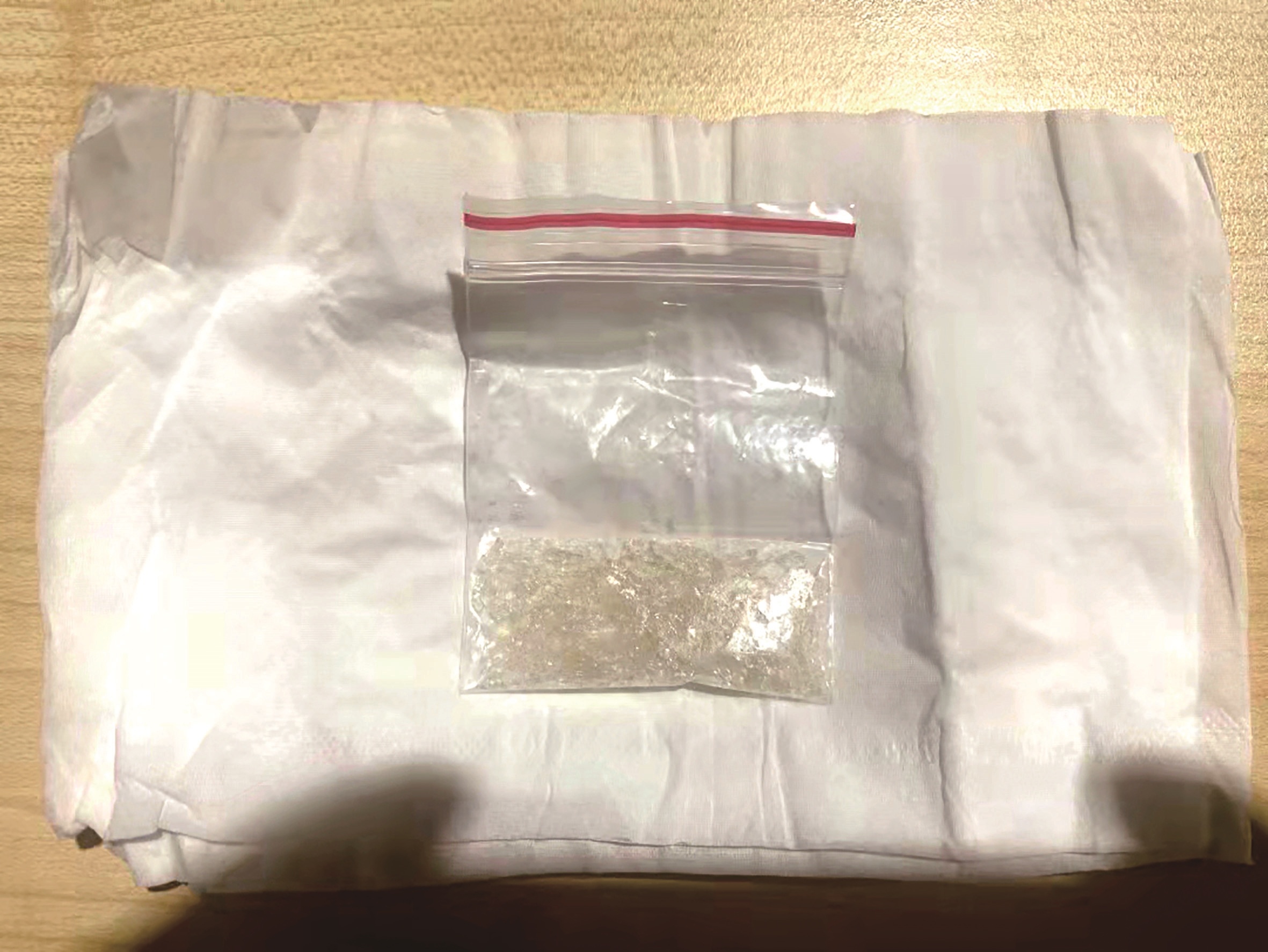 该寄递点的工作人员告诉民警,当天中午收了一个发出件,在例行检查时发现,包裹里是一个旧枕头,而且没有任何包装,非常可疑。民警当即按照物流寄递“三个100%”(100%开箱验视、100%实名登记、100%过机安检)的要求,在视频监控和快递点3名员工的见证下,对该包裹进行开箱检查。果然在枕芯内发现了一只透明塑料袋,袋内有一些透明晶体,疑似冰毒(如图)。寄递单据上显示,收货地是北京市丰台区某快递箱。