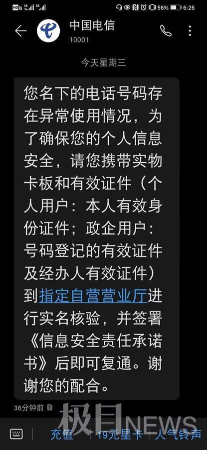“我是做培训主管的,跟外地员工正常业务沟通时,电话号码被电信无故停用。”9月15日,市民周先生向极目新闻反映,他给外地多名同事拨打电话交办工作,突然被电信停号,需到营业厅进行实名核验,签署承诺书才可复通。对此,湖北电信工作人员介绍,目前正在开展断卡行动和反电诈工作,客户号码存在异常使用情况,营业厅也是接到相关部门的要求作出停机处理。
